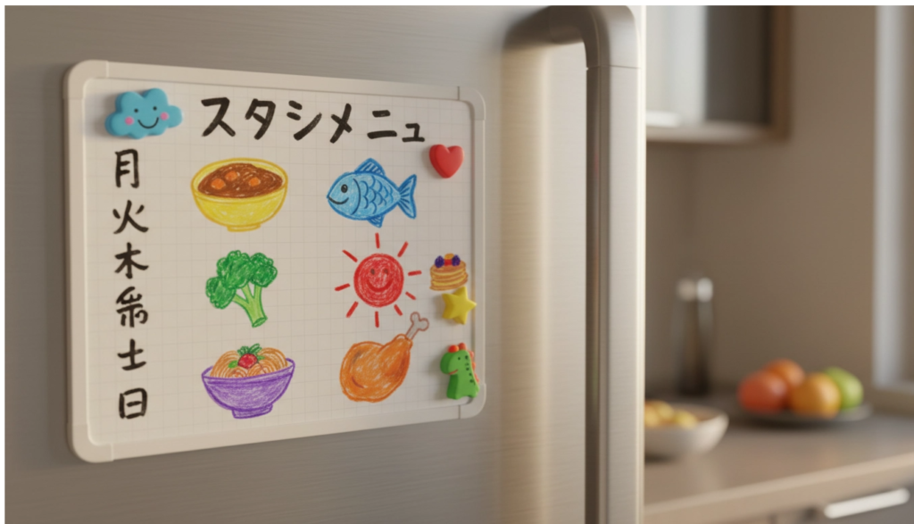 決まった献立は、ホワイトボードやキッチンのカレンダーに書き込みます。これが重要です! 「見える化」されることで、子どもたちは「明日は大好きな唐揚げだ!」と楽しみにでき、親は「今日はこれを作ればいいんだ」と脳のスイッチをオフにできます。