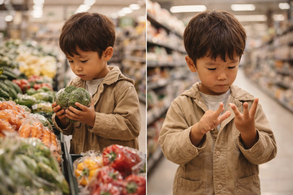 - お買い物大作戦: 「カレーの材料を3つ買ってきて」と頼んだり、商品の値札を見て「どっちが安いかな?」と比べたり。これだけで算数の基礎である「数」と「比較」の概念が身に付きます。