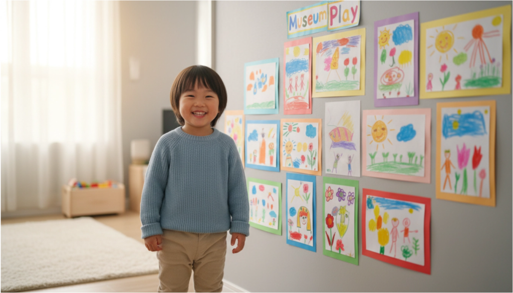 作品を壁に貼り、お子さんに隣に立ってもらって写真を撮ります。 「作品単体」よりも「作品とそれを作った時の本人」をセットで撮ることで、その時の体の大きさや表情も一緒に残せます。